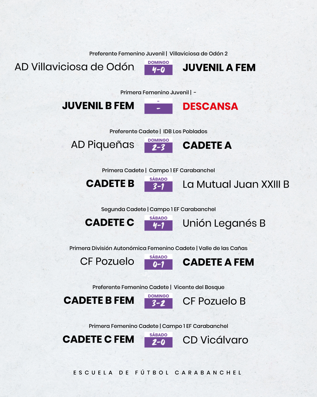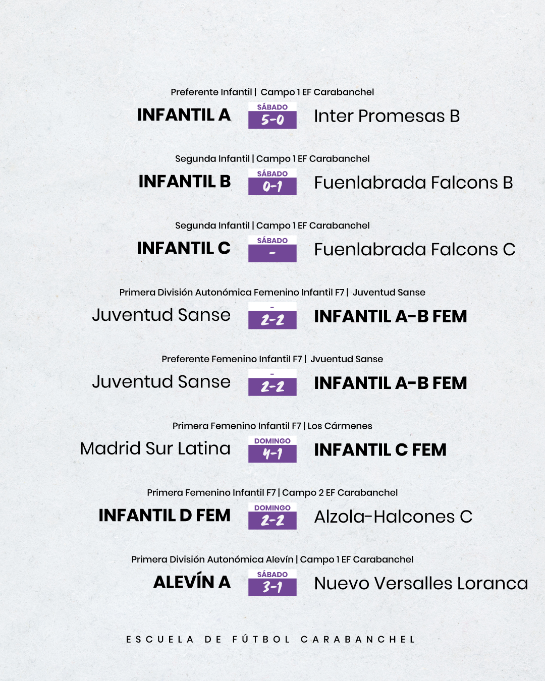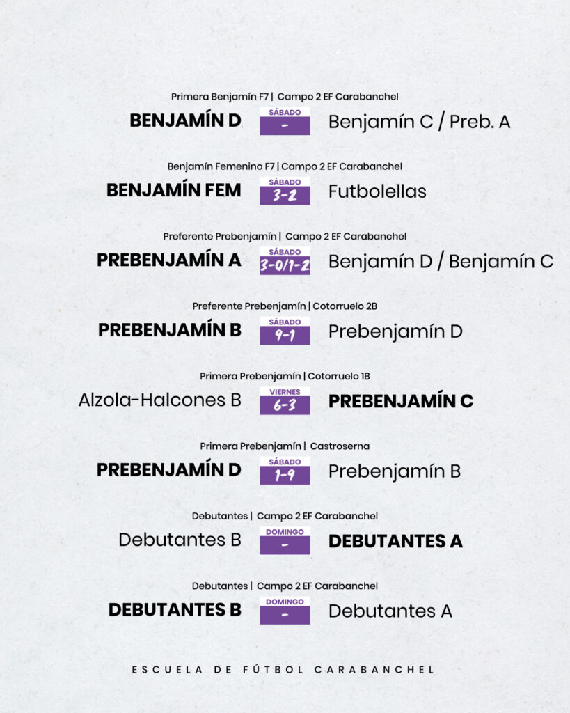 Resultados de todos los equipos de la Escuela de Fútbol Carabanchel masculinos y femeninos
