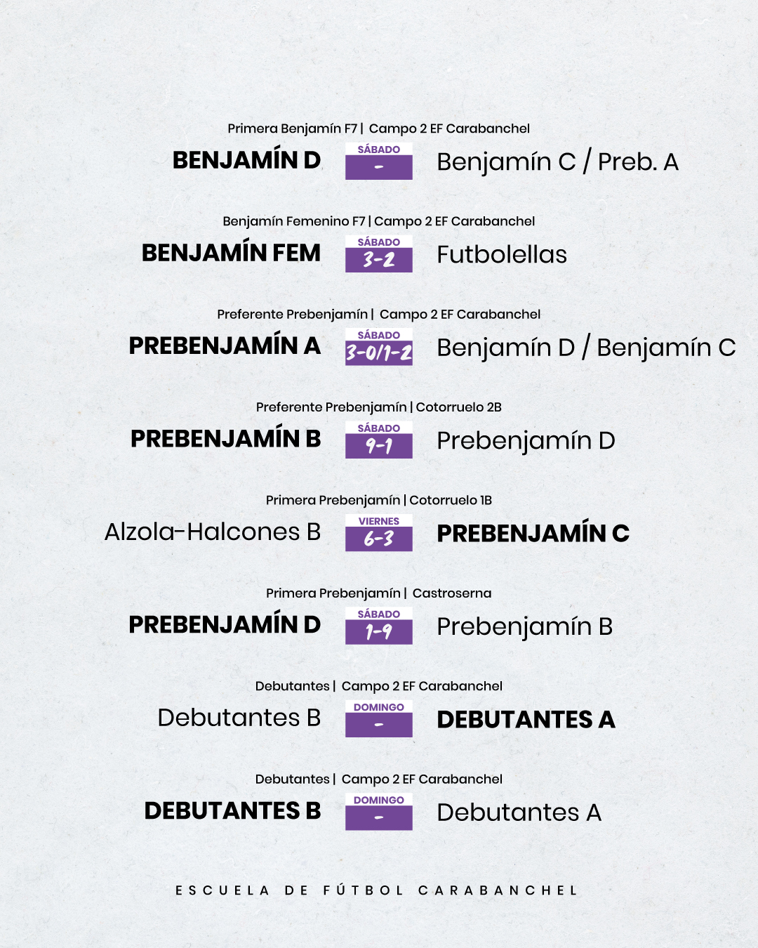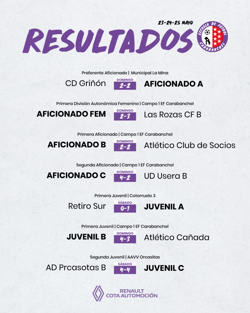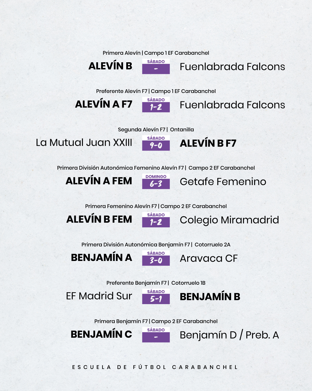 Resultados de todos los equipos de la Escuela de Fútbol Carabanchel masculinos y femeninos